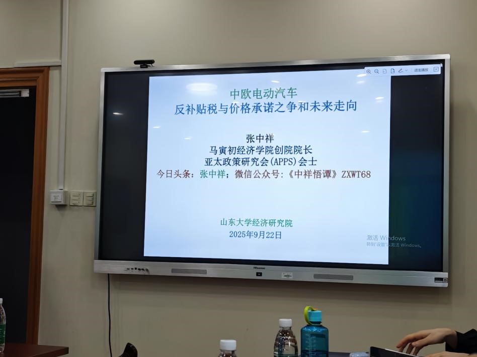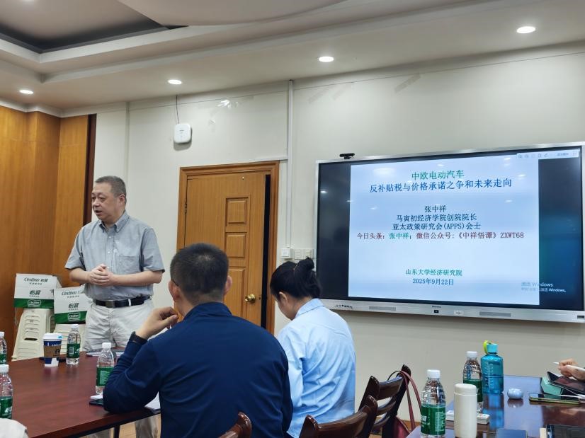 2025年9月22日下午14:30-17:00,365英国上市公司顺利开展山大“思考”经济学理论系列讲座(THINK Seminar)2025年第10期。天津大学张中祥教授应365英国上市邀请,开展了主题为《中欧电动汽车反补贴税与价格承诺之争和未来走向》的学术报告。365英国上市公司郑捷教授主持会议。